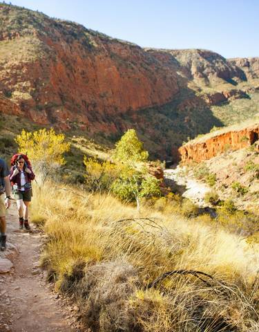 Deze zevendaagse Larapinta-wandeltocht begint en eindigt in Alice Springs. Je wandelt van Geoff Moss Bridge naar Wallaby Gap op de eerste dag, vervolgt je weg over het veertien kilometer lange Serpentine Ridge-pad en beklimt Mount Sonder bij zonsopgang.