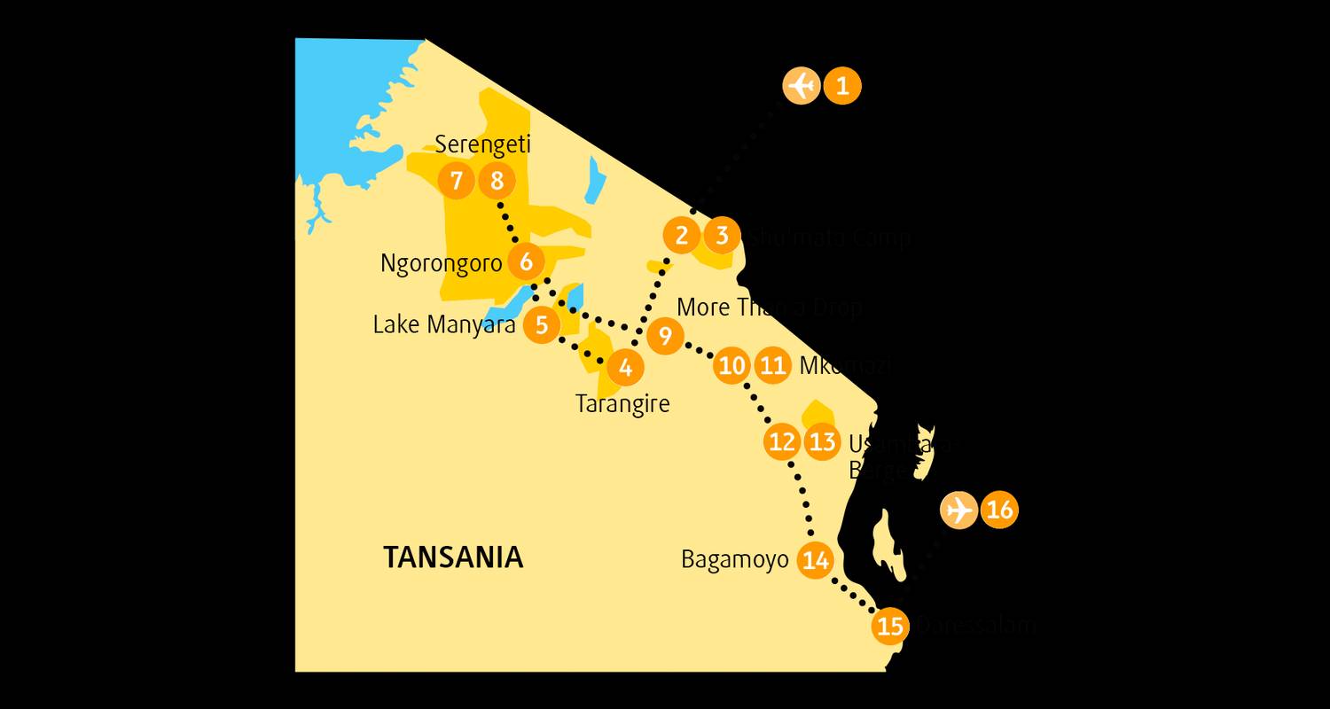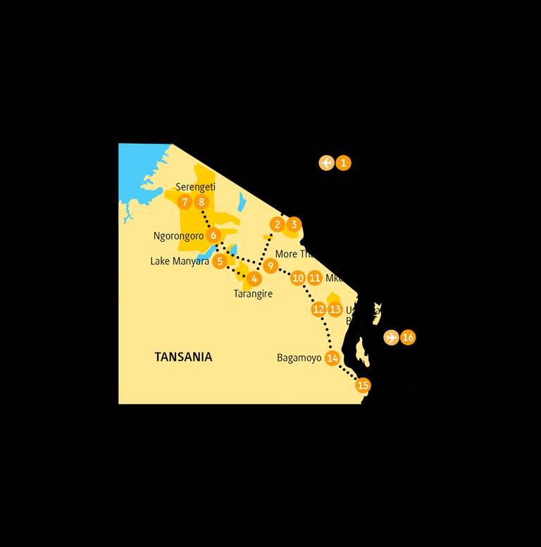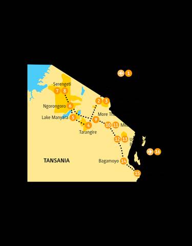 De natuurpracht van Tanzania ontvouwt zich gedurende 19 dagen van Arusha tot Dar es Salaam. De reis omvat zes belangrijke bestemmingen waaronder het Serengeti National Park, de Ngorongoro-krater en Gombe Stream. Met chimpansee tracking, safari's voor de Grote Vijf, Mount Makarot-wandeling en culturele onderdompeling in Mto wa Mbu.