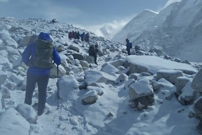 - Dag 11 Trek naar Everest Base Camp (5364m) & terug naar Gorekshep (5181m) 8 uur (overnachting in hotel met ontbijt,
