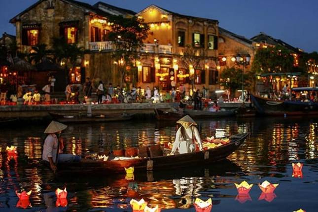 - Laat lantaarns los op de Hoai Rivier bij schemer