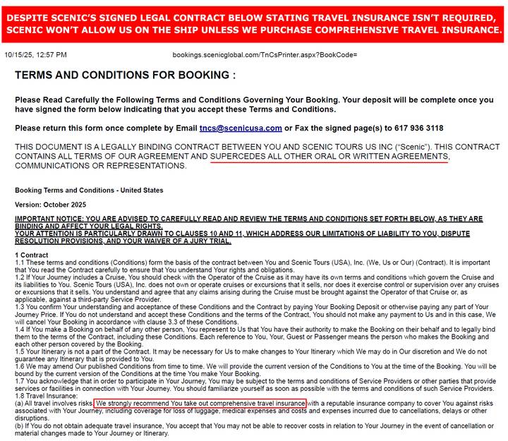 - JBJason· 20 november 2025Automatische vertaling beschikbaar in Nederlands. Bekijk in het NederlandsLET OP dat Scenic roekeloos je "boekingsvoorwaarden" schendt, dat is de contractuele overeenkomst waarmee je akkoord gaat en die voorrang heeft op alle andere schriftelijke documenten. Ondanks dat we dit ondertekende juridische document hebben waarin staat dat een reisverzekering optioneel is, vertelt Scenic ons dat we een uitgebreide reisverzekering moeten aanschaffen of dat ze ons niet op deze cruise toelaten. Scenic weigert ons contract te erkennen en beantwoordt mijn vragen hierover niet, maar ze zijn wel akkoord gegaan met een VOLLEDIGE TERUGBETALING van mijn 38.000 dollar cruise (wat betekent dat ze weten dat ze in gebreke zijn gebleven). Ik wacht nu op deze terugbetaling en ik heb ze een 1-sterren review beloofd voor elke dag dat ik moet wachten. Als ze gewoon hun excuses aanboden voor de tegenstrijdige eisen en beloofden het beter te doen, zou alles goed zijn geweest.MeerReisdatum: november 2025